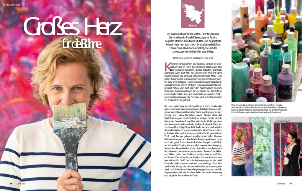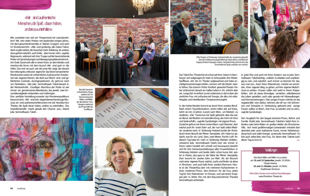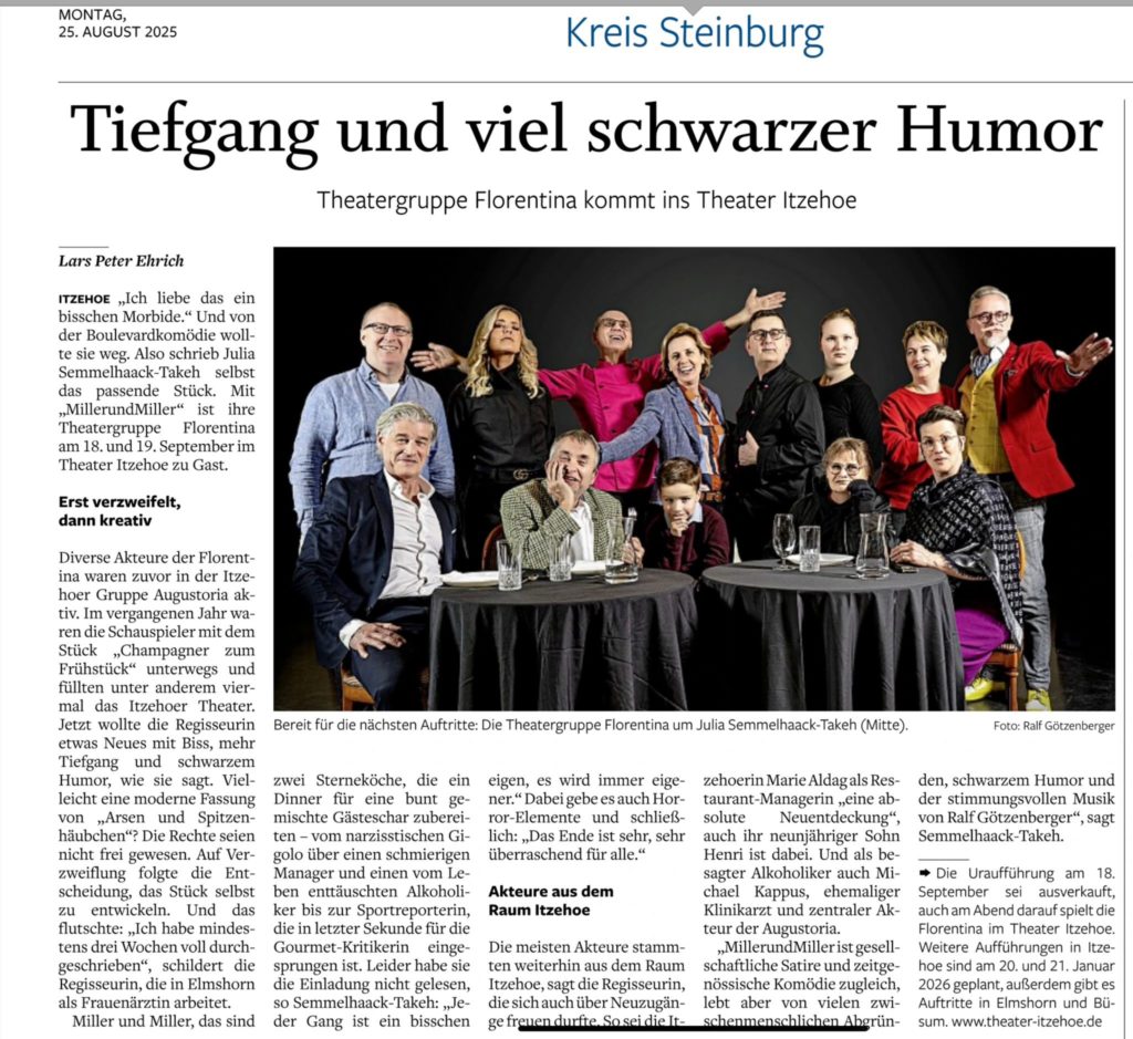„Ich liebe das ein bisschen Morbide.“ Und von der Boulevardkomödie wollte sie weg. Also schrieb Julia Semmelhaack-Takeh selbst das passende Stück. Mit „MillerundMiller“ ist ihre Theatergruppe Florentina am 18. und 19. September im Theater Itzehoe zu Gast.
